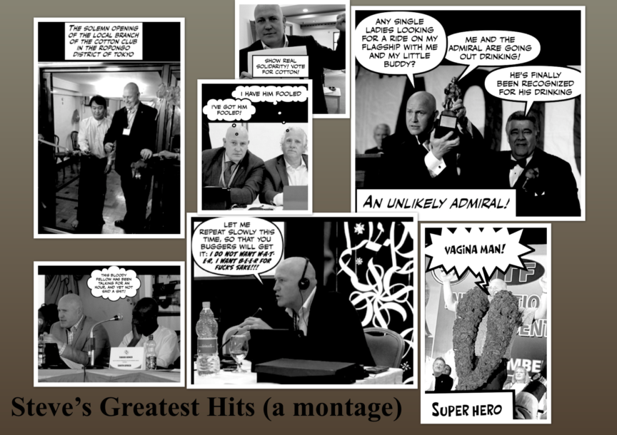 In 2016, a meme circulated on a messaging app by David Heindel, chairman of the ITF’s seafarers section. The meme was titled “Steve’s greatest hits (a montage)”, and included images such as Cotton holding an award with the caption “Any single ladies looking for a ride on my flagship with me and my little buddy?” and another proclaiming Cotton as “Vagina man!”, a superhero. Cotton commented that it was “beautifully crafted”.