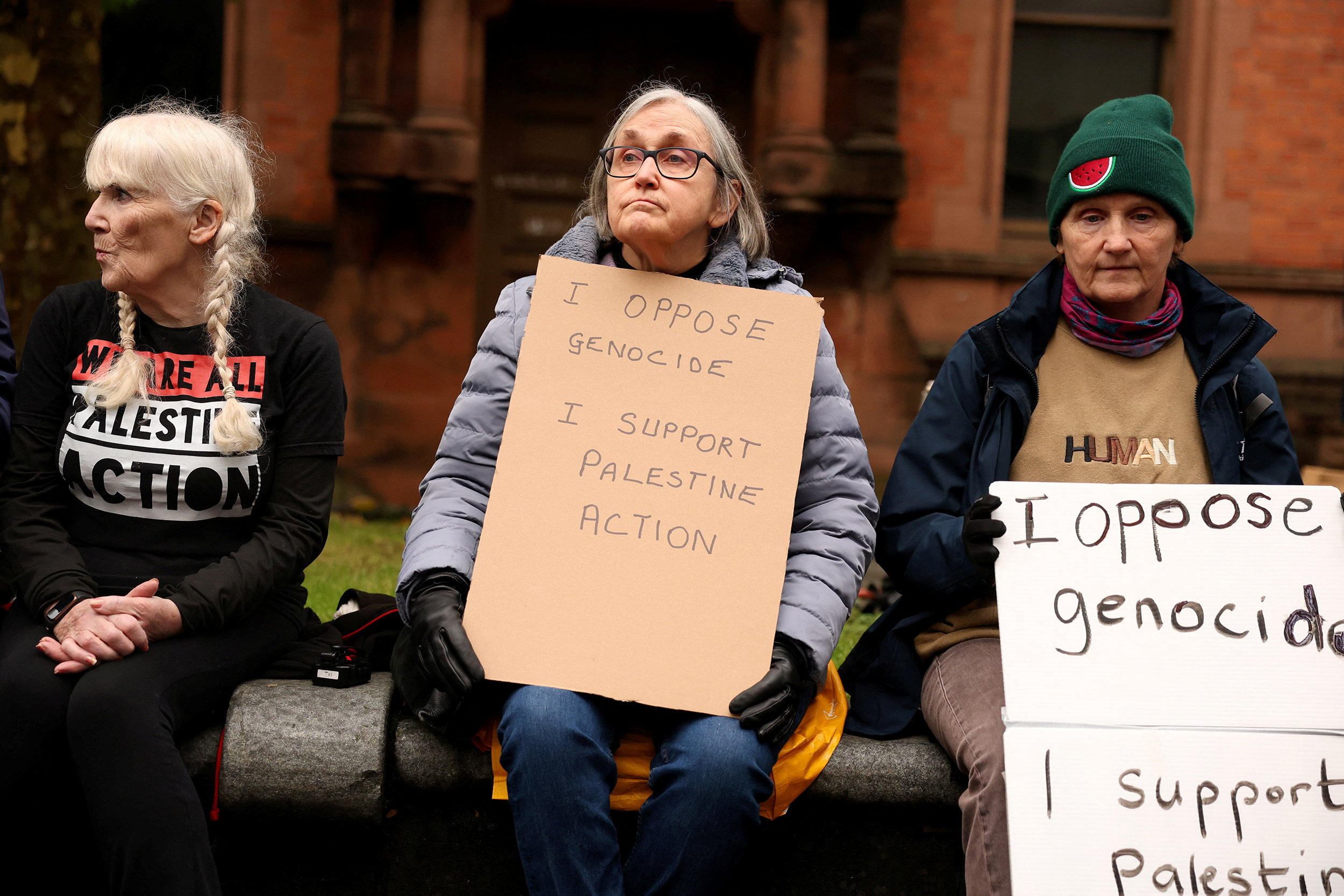 On Saturday, a group of 12 protesters in Belfast held handmade signs reading “I oppose genocide – I support Palestine Action” outside the Royal Courts of Justice, flanked by more than 50 supporters. Four Police Service of Northern Ireland (PSNI) officers observed the protest from a short distance, but did not intervene. Later that day, activists held signs with the same message outside the Guildhall in Derry. The PSNI made no arrests there either.