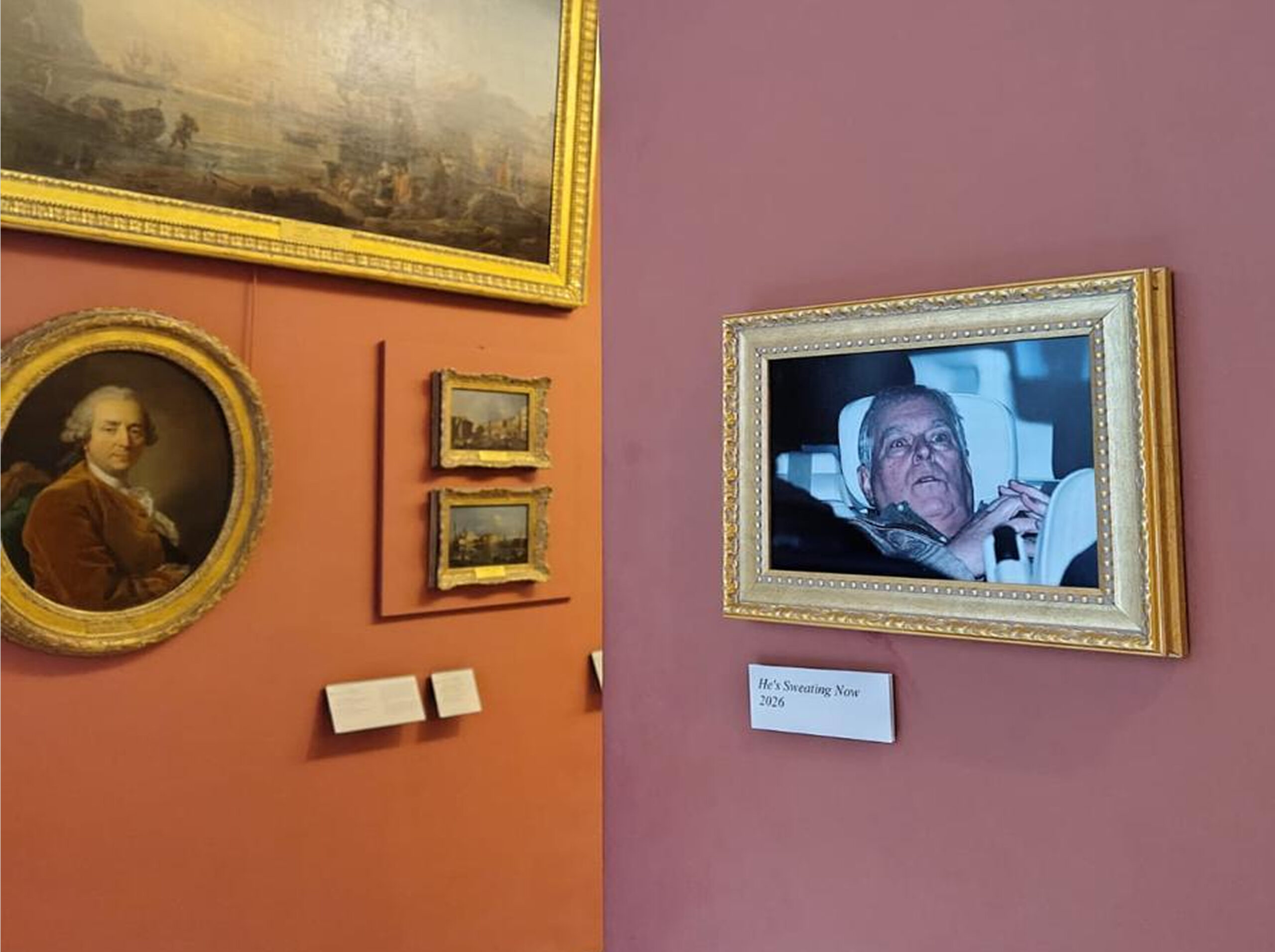 A framed photograph of Andrew Mountbatten-Windsor, taken shortly after his arrest last week, was mounted in the Louvre by a group of British activists.
