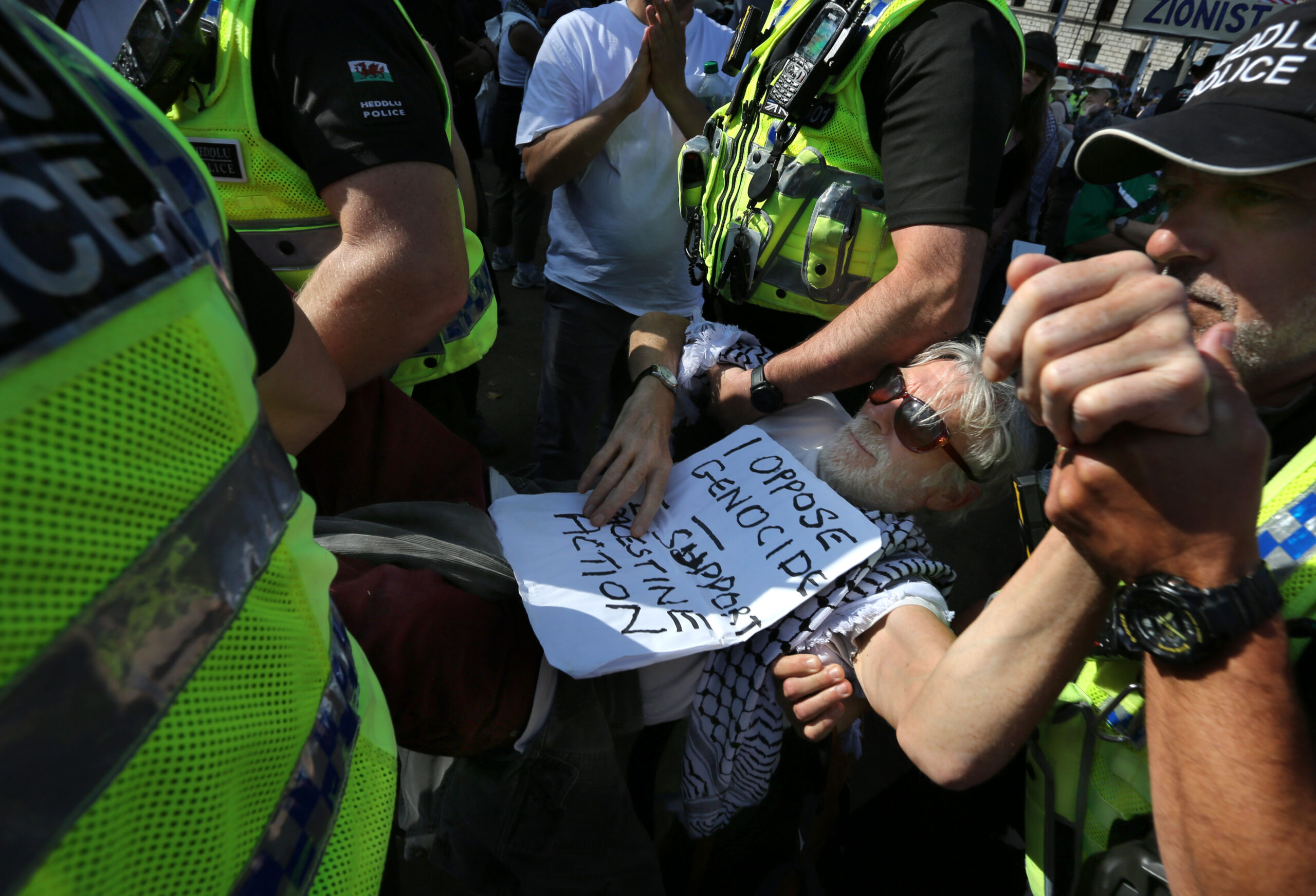 Eighteen people were arrested on Saturday for holding signs that read “I oppose genocide. I support Palestine Action” during a protest outside New Scotland Yard in London.