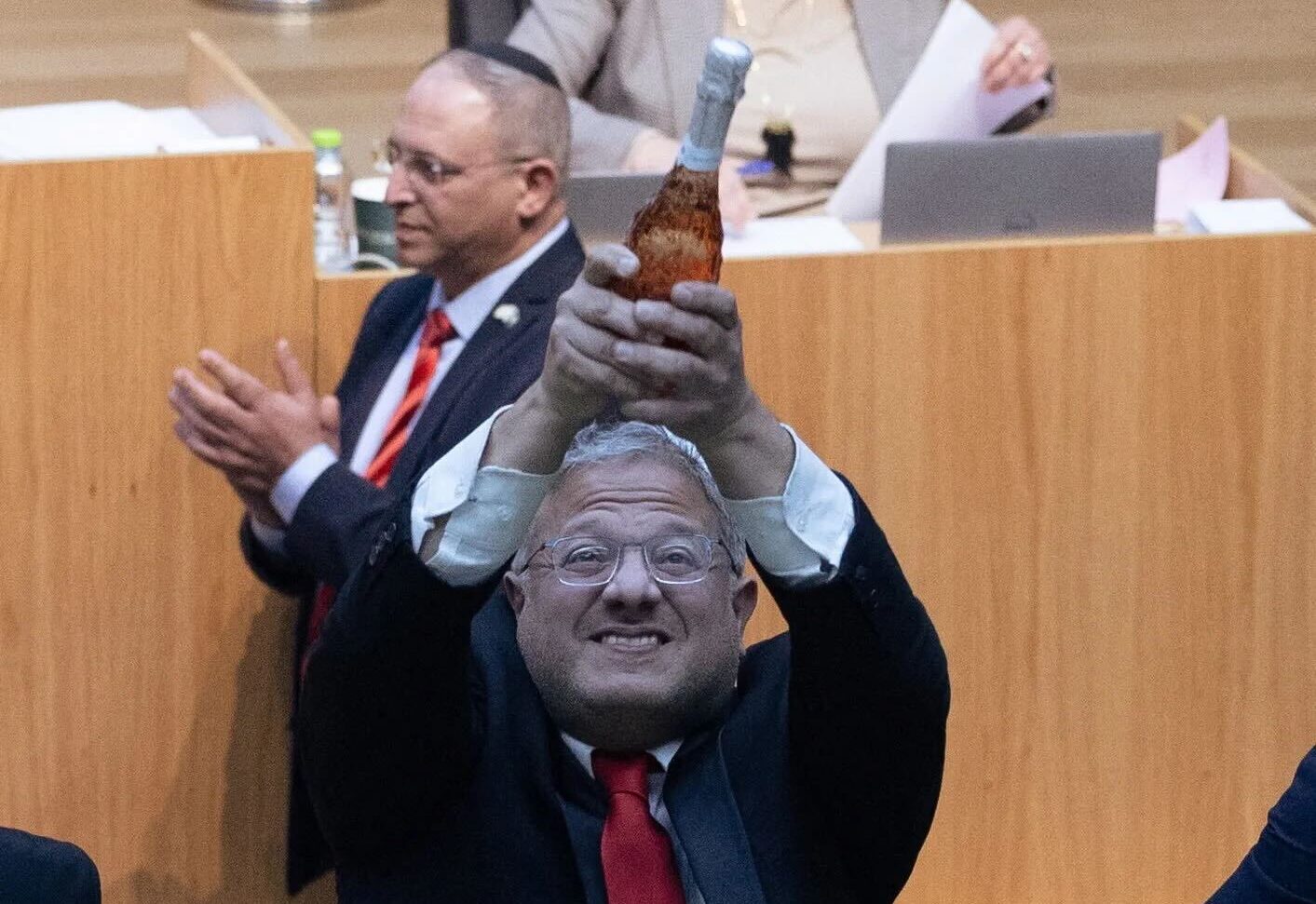 He was filmed brandishing a bottle of champagne in Israeli parliament, in celebration of the bill passing.